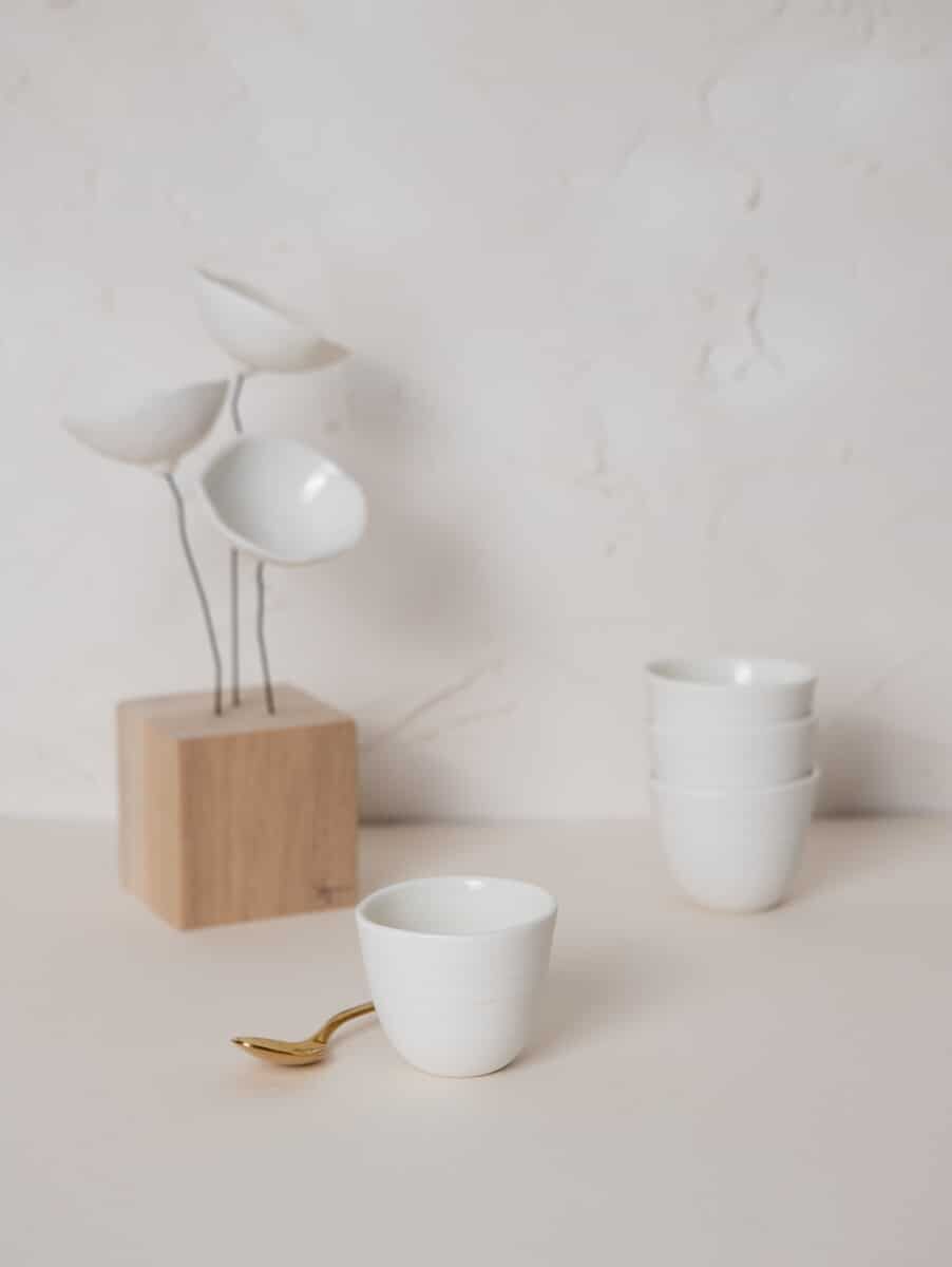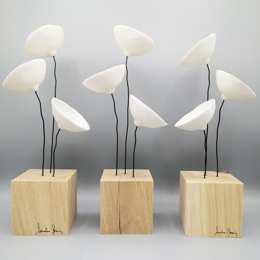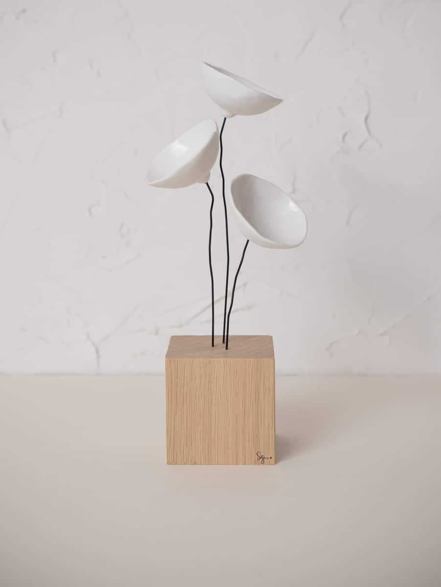 Fleurs en porcelaine blanche La porcelaine est laissée mate à l’extérieur, et émaillée transparent brillant à l’intérieur 3 brins montés sur tige acier Socle cube en chêne naturel 7×7 cm